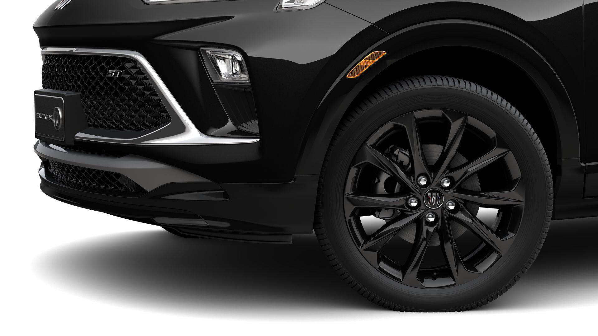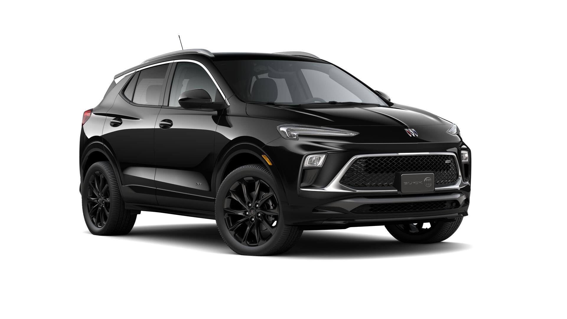 2026 Buick Encore GX Sport Touring in Ebony Twilight Metallic and Ebony Seats Interior With Santorini Blue Stitc Premium Synthetic and is equipped with the following: AWD ECOTEC 1.3L Turbo Experience Buick Package (Power Panoramic Tilt-Sliding Moonroof and Wheels: 19 Gloss Black Aluminum), Preferred Equipment Group 1SD, 3.17 Final Drive Axle Ratio, 4-Way Manual Passenger Seat Adjuster, 4-Wheel Disc Brakes, 6-Way Manual Driver Seat Adjuster, 7 Speakers, ABS brakes, Air Conditioning, Alloy wheels, AM/FM radio: SiriusXM, Auto High-beam Headlights, Automatic temperature control, Brake assist, Bumpers: body-color, Compass, Delay-off headlights, Deleted Mobile Service Plus, Driver door bin, Driver vanity mirror, Dual front impact airbags, Dual front side impact airbags, Electronic Stability Control, Emergency communication system: OnStar and Buick connected services capable, Enhanced Performance 7-Speaker System with Amplifier, Front anti-roll bar, Front Bucket Seats, Front Center Armrest, Front reading lights, Front wheel independent suspension, Fully automatic headlights, Heated door mirrors, Illuminated entry, Knee airbag, Leatherette Seat Trim, Low tire pressure warning, Mechanical Jack with Tools, Occupant sensing airbag, Outside temperature display, Overhead airbag, Overhead console, Panic alarm, Passenger door bin, Passenger vanity mirror, Power door mirrors, Power steering, Power windows, Radio data system, Radio: AM/FM Audio System, Rear reading lights, Rear side impact airbag, Rear window defroster, Rear window wiper, Remote keyless entry, Ride and Handling Suspension, Security system, SiriusXM Trial Subscription, Speed control, Speed-sensing steering, Split folding rear seat, Spoiler, Sport steering wheel, Steering wheel mounted audio controls, Tachometer, Telescoping steering wheel, Tilt steering wheel, Traction control, Trip computer, Variably intermittent wipers, Wheels: 18 Gloss Black Aluminum, and Wireless Apple CarPlay/Wireless Android Auto.